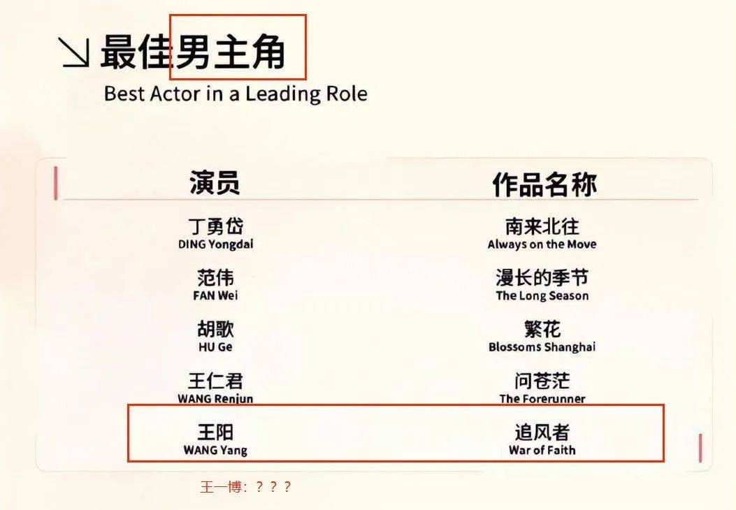 在白玉兰奖入围名单公布后,位于《追风者》领衔主演一番的王一博并未获得提名,而位于三番领衔主演的王阳则获得了最佳男主角的提名。名单公布后,立刻引发了广大王一博粉丝的不满,在微博、豆瓣等社交平台上持续讨论,近几天频繁登上热搜。