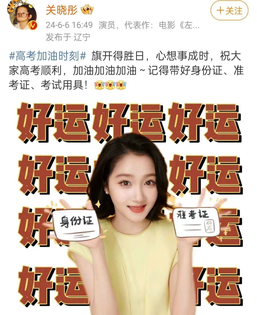 关晓彤在送祝福的同时,不忘提醒考生带好身份证和准考证,以及考试用具,满屏的好运来袭,祝愿大家都能心想事成。