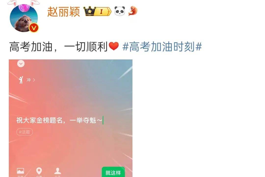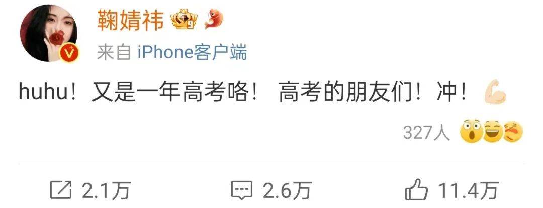 其实,除了跑男上的明星,还有很多明星也发文,为高考学子加油。比如鞠婧祎,她希望高考的朋友们都能向前冲。