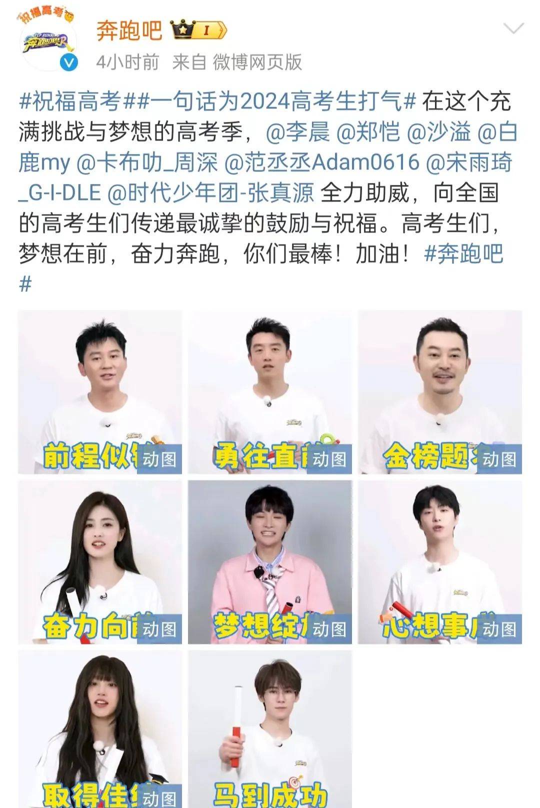 李晨、郑恺、沙溢、白鹿、周深、范丞丞、宋雨琦、张真源都为考生加油打气,祝大家都能实现梦想。