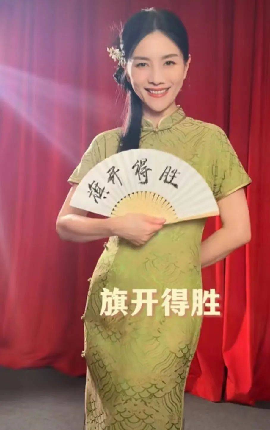 同样祝福考生旗开得胜的还有胡可,她身穿旗袍,手持带有“旗开得胜”字样的扇子,寓意很好,看得出很用心在祝福了。