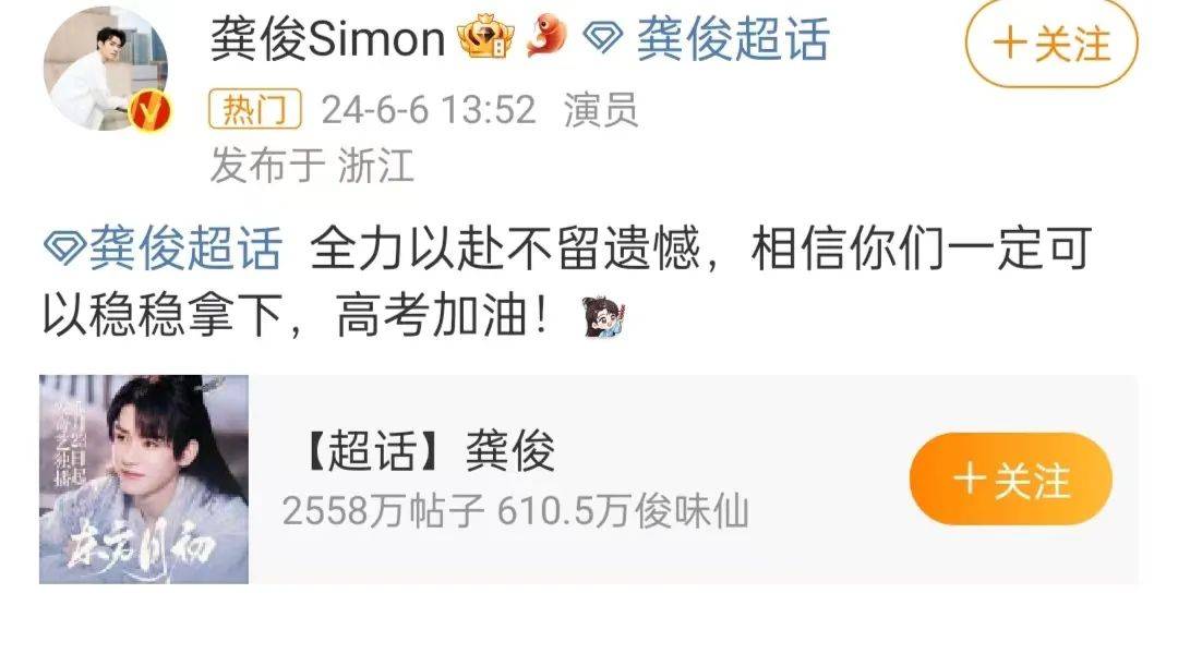 热播剧《狐妖小红娘月红篇》男主龚俊,去自己的超话给粉丝加油打气,他祝愿高考的粉丝全力以赴不留遗憾,相信他们一定可以稳稳拿下。