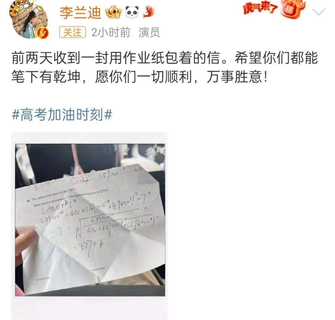 李兰迪晒出一封用作业纸包的信,希望考生都能笔下有乾坤,一切顺利、万事胜意。