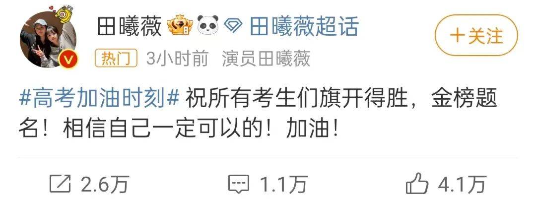 田曦薇也发文祝愿考生金榜题名,告诉考生相信自己一定可以。