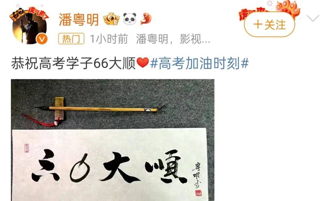 潘粤明则是晒出“六六大顺”的书法,寓指高考一切顺利,学子一切顺利。