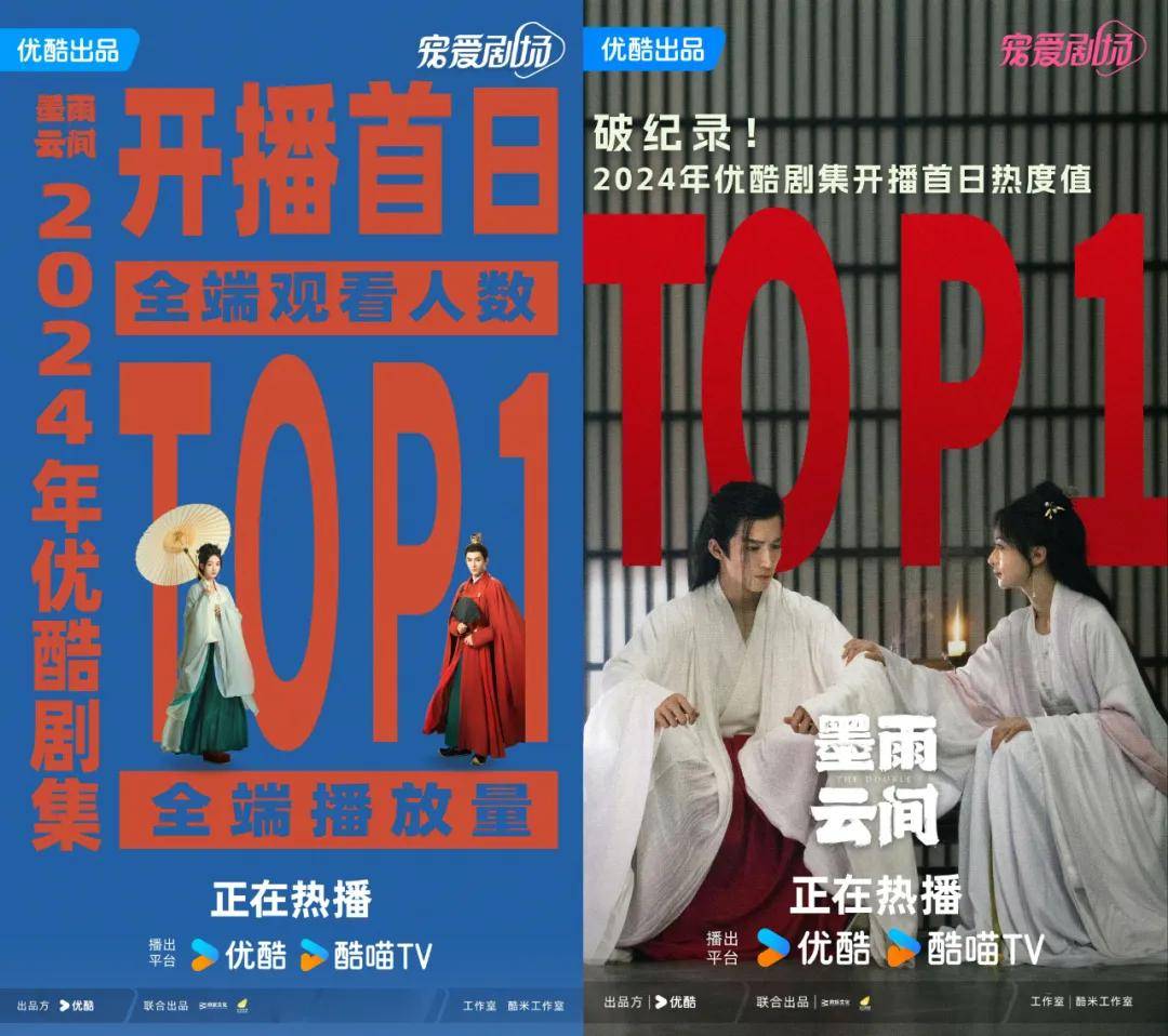 开播即登上优酷2024新剧开播首日播放量Top1,同时成为优酷2024年开播首日热度最高的剧集,上线两天正片累计播放量突破1亿,紧接着上线第三天热度值破万,并成为优酷2024年热度值最快破万剧集,网友一口气看五集后直呼“过瘾”,成为全民解压爆款爽剧,更有人民文娱评《墨雨云间》“‘爽’在人的成长美的呈现……”