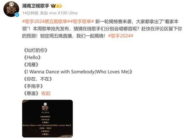 今日,《歌手2024》第五期竞演歌单新鲜出炉,分别为《灿烂的你》《Hello》《鸿雁》《I Wanna Dance with Somebody(Who Loves Me)》《你在,不在》《手拖手》《悬崖》。