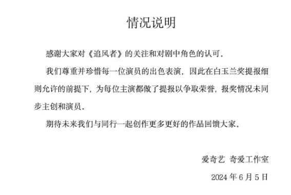 搜狐娱乐讯 6月5日,电视剧《追风者》就近期白玉兰奖提名争议发布情况说明,回应称“感谢大家对《追风者》的关注和对剧中角色的认可”,并表示“在白玉兰奖提报细则允许的前提下,为每位主演都做了提报以争取荣誉,报奖情况未同步主创和演员。”