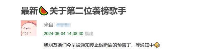 还有曾多次第一时间爆料《歌手2024》彩排录制消息的网友帮忙补充细节,称《歌手》栏目组已经被通知停止做断眉的预告,具体消息还在通知。离《歌手》第五期直播还有3天时间,离断眉录制时间还有小半个月的,节目组此时停止预热宣传足以说明舆情严重到一定地步,不容忽视。