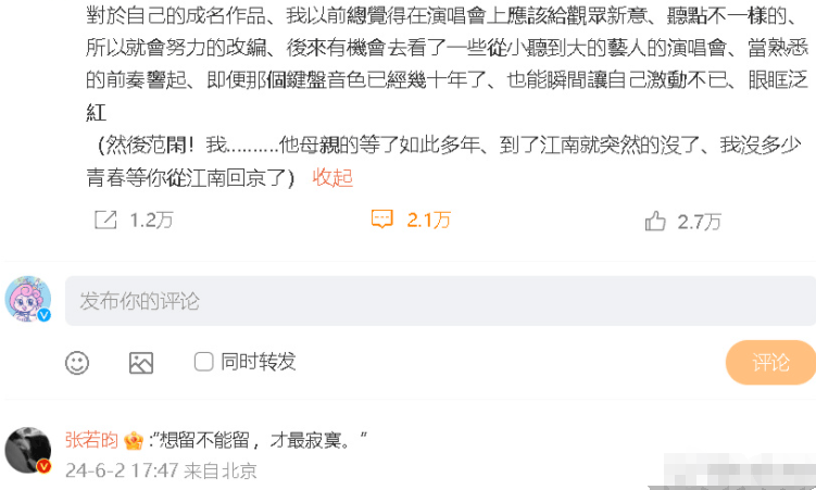 搜狐娱乐讯 6月2日,苏见信在社交媒体平台发文谈了点工作感悟后,追剧人格上线大喊话:“范闲!我……….他母亲的等了如此多年、到了江南就突然的没了、我没多少青春等你从江南回京了。”随后,张若昀 用《离歌》歌词回复:“想留不能留,才最寂寞。”