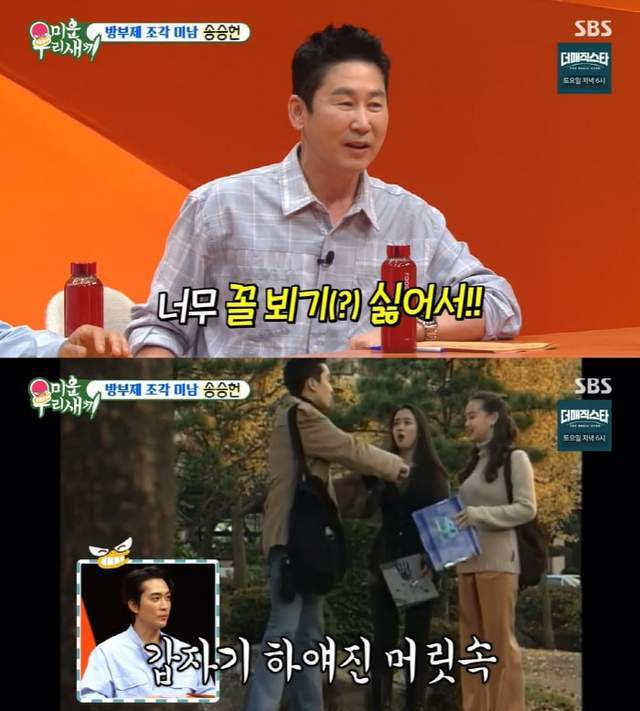节目中,宋承宪过去的照片公开,对于最先成为热门话题的过去的美貌,宋承宪表示,虽然不说什么,但我总觉得小时候是不一样的。申东烨说,你不觉得你的五官从小就很清晰吗?人们说他从出生起就是一个英俊的男人,他公开了宋承宪过去的照片,称“据说他年轻时准备了一张照片”。