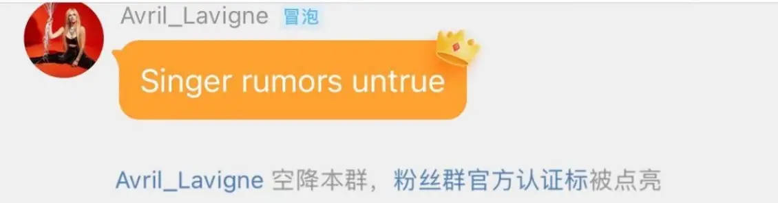 搜狐娱乐讯 6月2日,艾薇儿在个人粉丝群里现身,否认了将参加《歌手》并成为第三位袭榜歌手的传闻:“Singer rumors untrue”。艾薇儿还透露自己因为巡演实在是太忙了,并表示自己很期待能来中国开巡演。