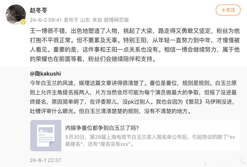 6月2日一早,编剧赵冬苓下场,为王阳叫屈,认为王阳是无辜的,他从青年一直努力到中年,才被慢慢看到等等。有网友对于赵冬苓的发言,给出了一个有意思的解读:王一博你还年轻,让一让中年人吧。