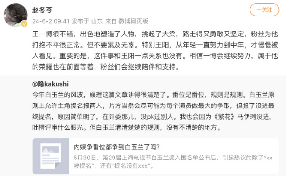 搜狐娱乐讯 6月2日,编剧赵冬苓 发文谈“王一博王阳白玉兰提名”争议。她先是夸赞王一博出色地塑造了人物,挑起了大梁,路走得又勇敢又坚定,属于他的荣耀在前面等着。