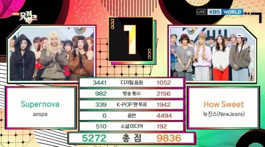 5月31日,音乐节目《音乐银行》开播,NewJeans击败aespa ,获得第一名提名。最终,NewJeans 的《How Sweet》夺得第一名,这也是该组合凭借这首歌第二次获胜。