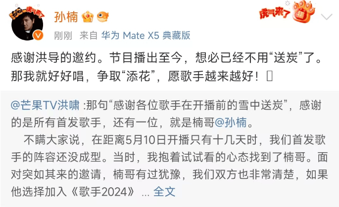 随后,孙楠也转发回应说:感谢洪导的邀约,我就好好唱,争取做到添花。