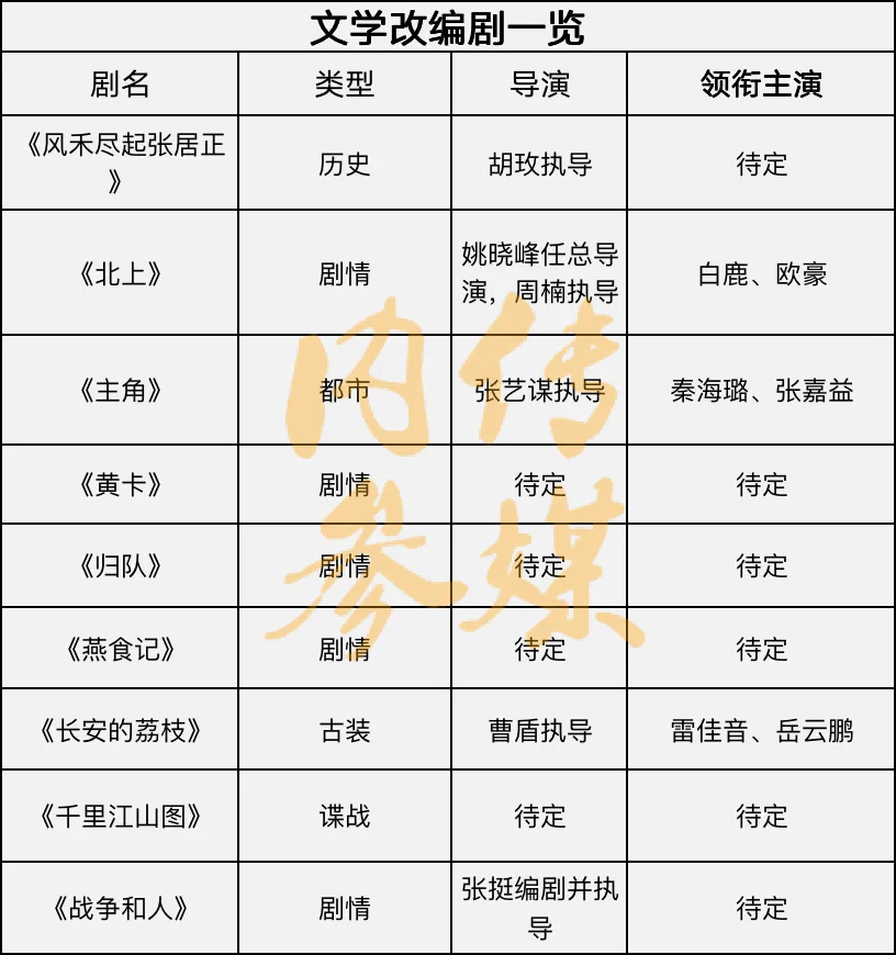 据不完全统计,目前待播的文学改编剧达9部以上,包括《风禾尽起张居正》《北上》《主角》《黄卡》《归队》《燕食记》《长安的荔枝》《千里江山图》《战争和人》。