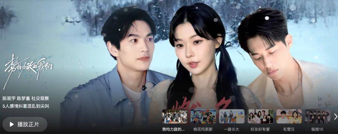 这是最近腾讯视频的一张首页宣传头图。说实话,犀牛君的第一眼,还以为《燃冬》出剧版了,这两男一女拉满雄竞感的戏剧张力,你敢相信它只是个恋综?