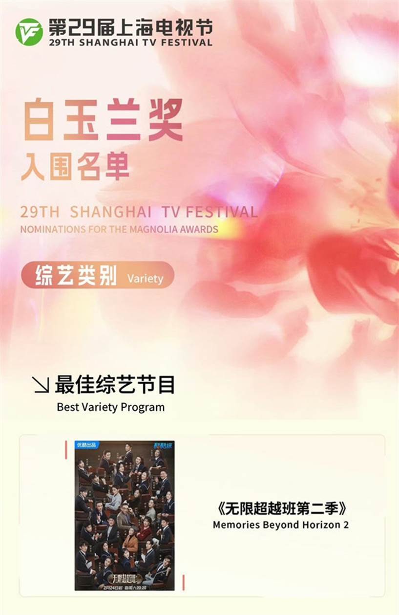 5月30日晚,第29届上海电视节白玉兰奖入围名单公布,其中,优酷综艺《无限超越班2》入围“最佳综艺节目”。