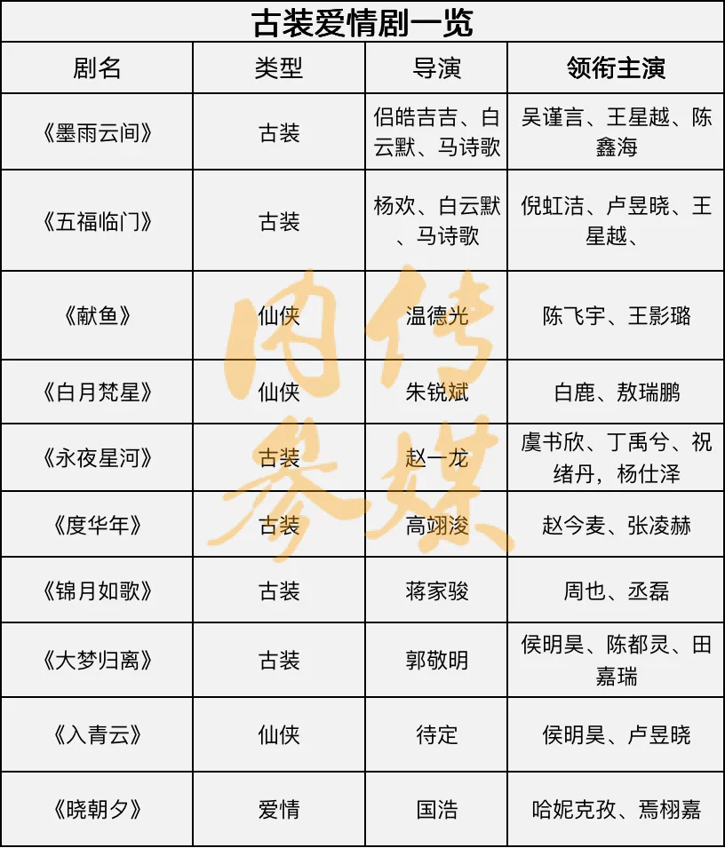 目前待播的古装爱情剧达10部以上,包括《墨雨云间》《五福临门》《献鱼》《白月梵星》《永夜星河》《度华年》《锦月如歌》《大梦归离》《入青云》《晓朝夕》。