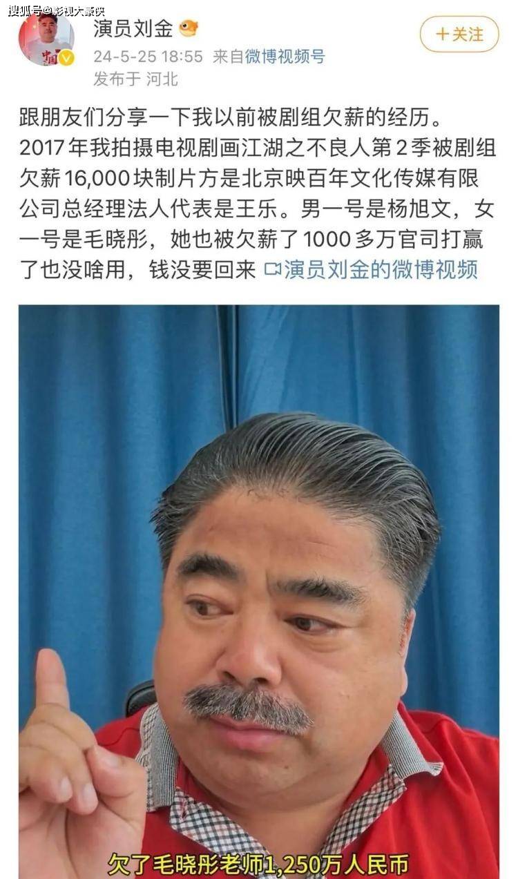 消息由曾在电影《夏洛特烦恼》中出演龙套角色的刘金在微博爆出,他提到,自己曾参与2017年开机拍摄的《画江湖之不良人2》,但被剧组欠薪16000元,且至今仍未要回,而被欠薪的不仅仅是他一个小龙套。“我们这个戏的女一号毛晓彤老师起诉了这个公司,并且胜诉了,执行的时候说这个公司名下没有任何可执行的财产……(该公司)欠了毛晓彤老师1250万人民币。”