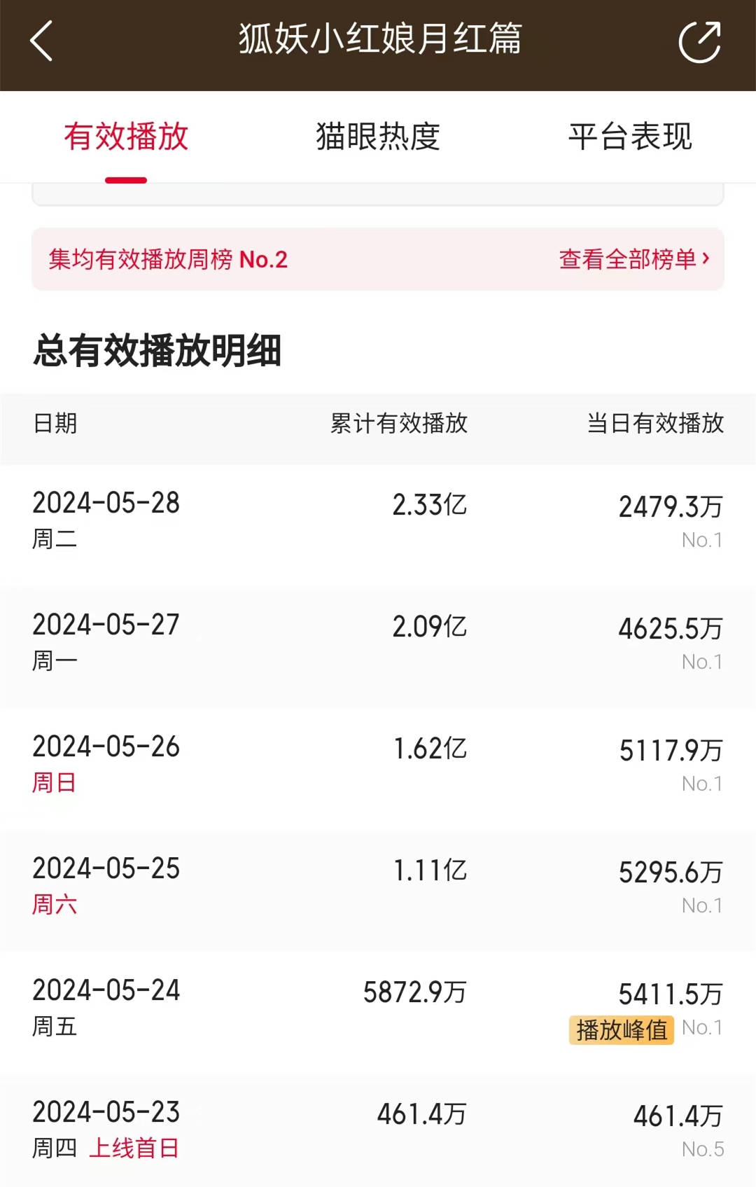 这份数据显示,该剧上线第二日,实现单日有效播放的峰值,是5411.5万。第三日,该剧的单日有效播放成绩开始下滑,到了5295.6万。接下来,则是5117.9万,4625.5万……按理说,随着《狐妖小红娘》更新集数的增多,单日有效播放数字会持续增长才是。