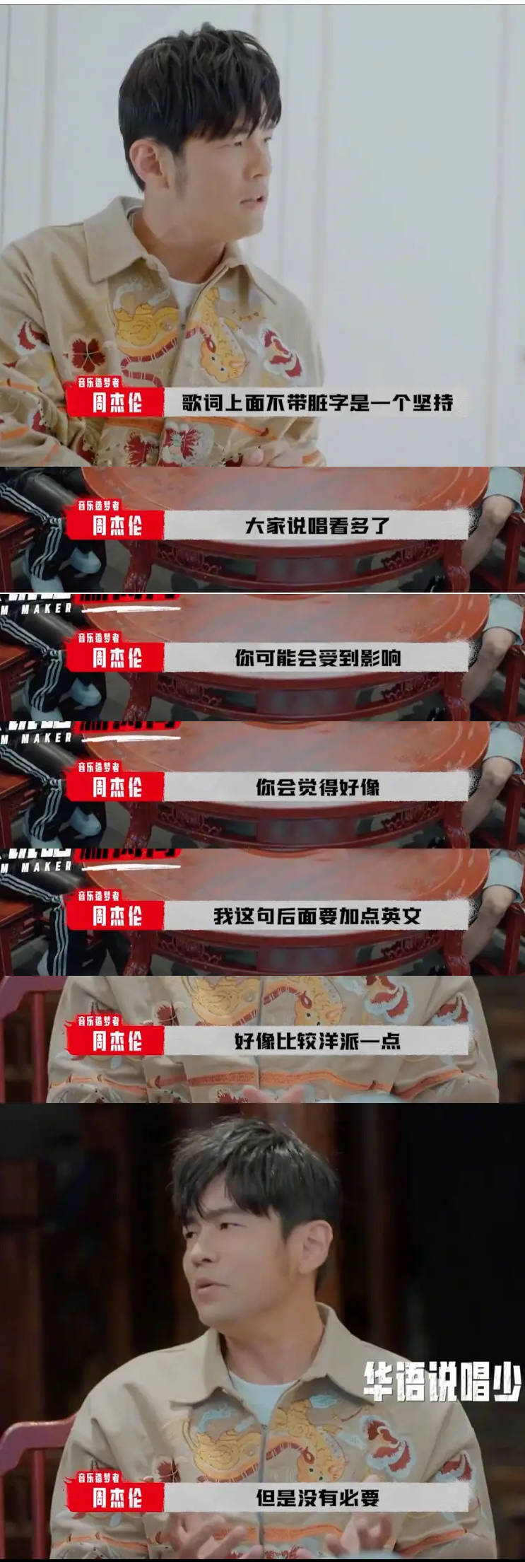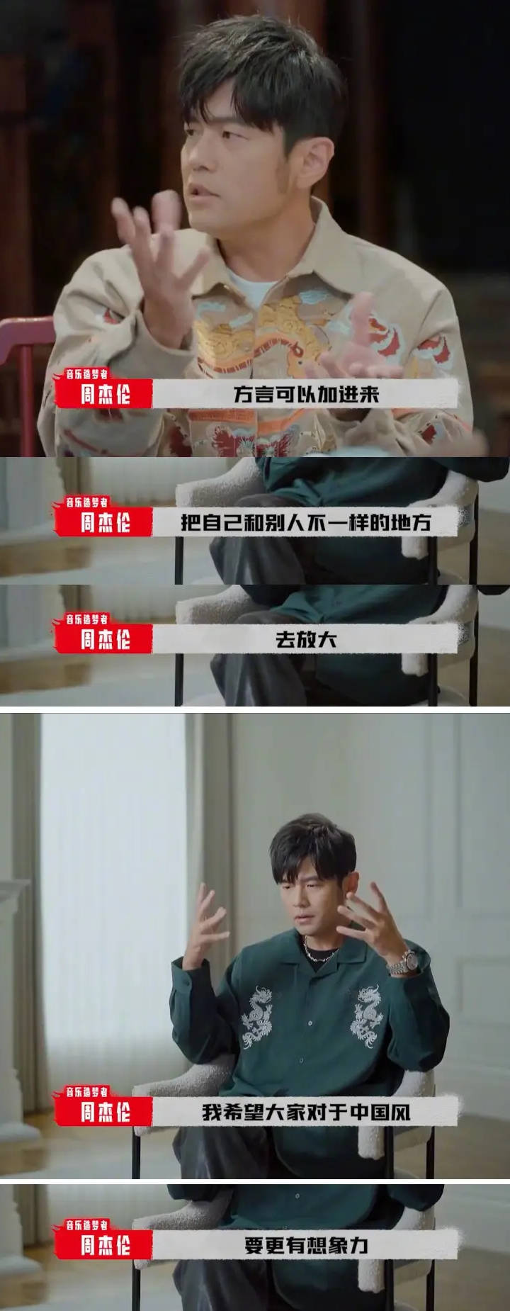 周杰伦还表示:“我希望大家对于中国风要更有想象力,就是不只有歌词上面,然后配乐上面,编曲上面,要怎么跟别人不一样,要加怎么样的民族乐器在里面,要怎么样的方言在里面,可能一把吉他,简简单单的,它也可以是很有魅力的。”