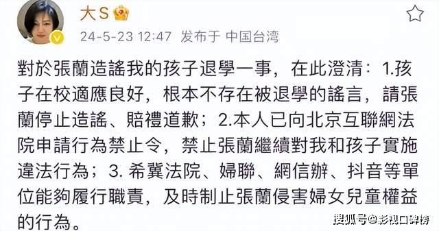 新瓜来了!大S在社交平台上发文:孩子在校适应良好,根本不存在被退学的谣言,请张兰停止造谣、赔礼道歉。