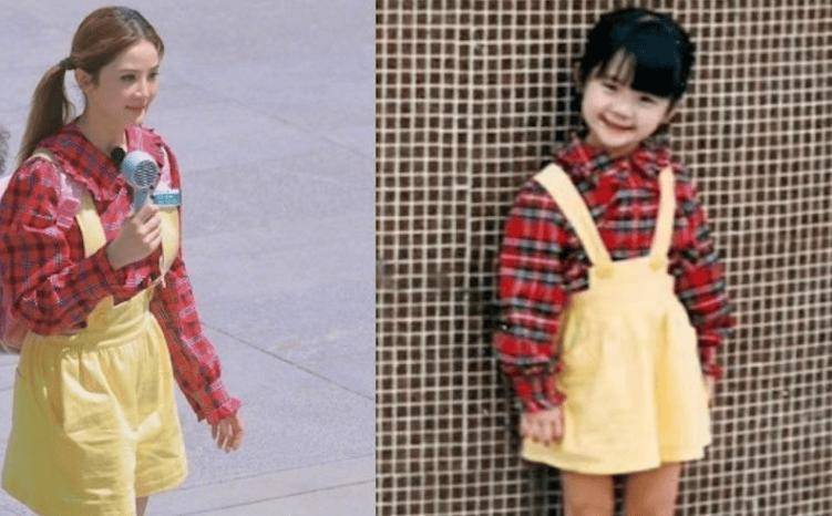 而她这一身打扮明显是复刻童年时期的造型,服装一模一样,只是发型稍微改变,整体还原度相当成功。