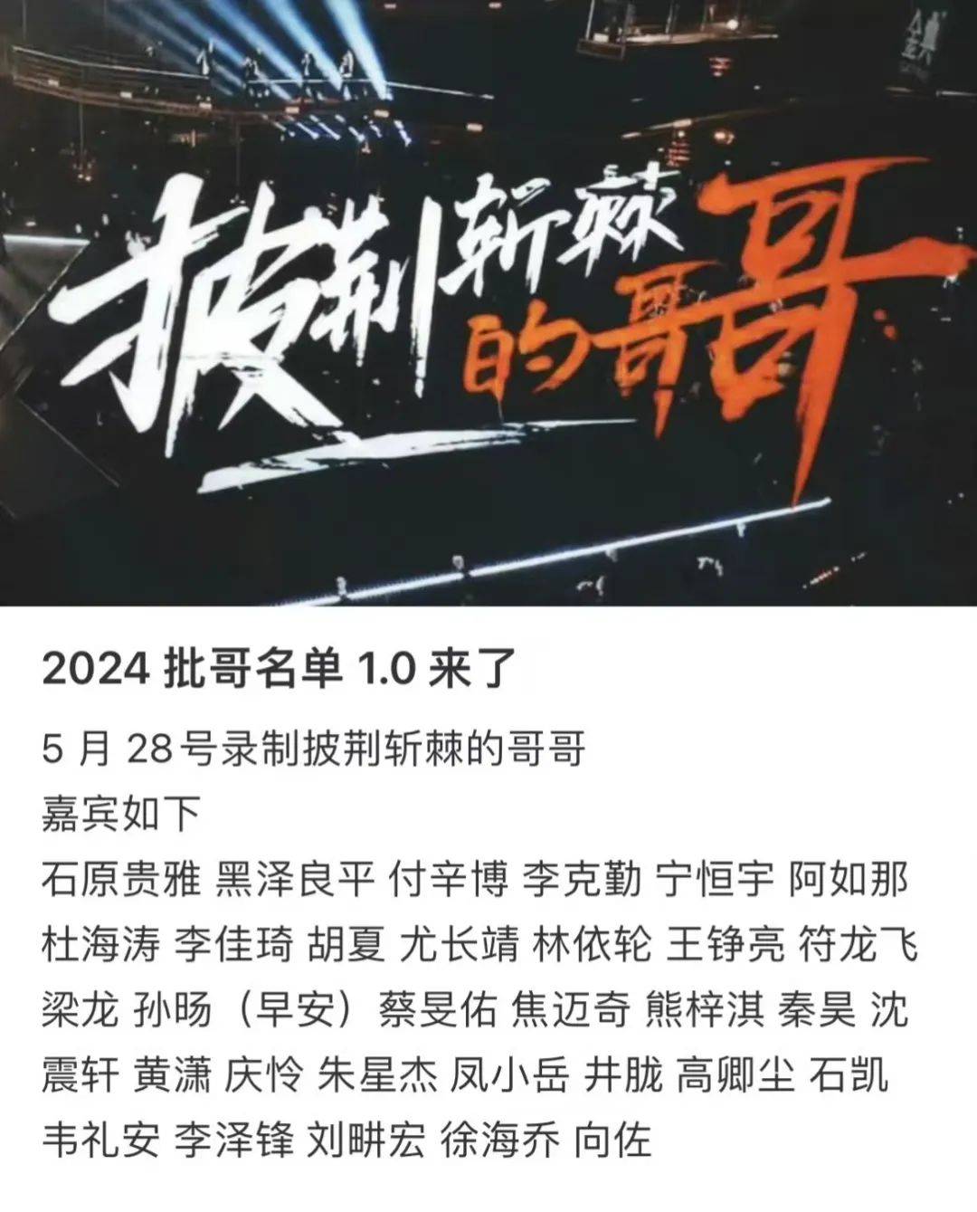 《浪姐5》还没结束,《披哥4》也要提上日程了,从网传名单来看,这季的阵容十分豪华,胡夏、尤长靖、王铮亮、符龙飞等专业歌手加入。