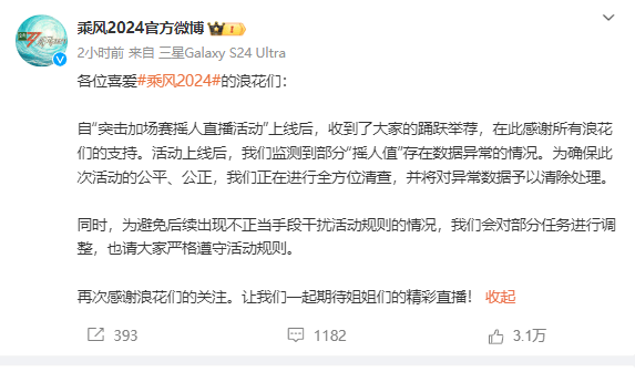 搜狐娱乐讯 5月23日,《乘风2024》官方发文回应投票数据注水:我们监测到部分“摇人值”存在数据异常的情况。为确保此次活动的公平、公正,我们正在进行全方位清查,并将对异常数据予以清除处理。同时,为避免后续出现不正当手段干扰活动规则的情况,我们会对部分任务进行调整,也请大家严格遵守活动规则。