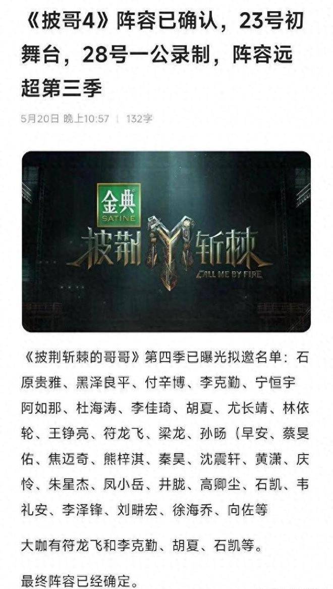 另外今年的《披荆斩棘》的“哥哥”名单已经有过很多版本,早前曝光的受邀哥哥有:王力宏、大张伟、魏晨、杨坤等几位歌手,胡歌、郑元畅等演员哥哥,还有说唱歌手艾热等,“0713”的部分成员也会受邀。据悉该节目在23号录制初舞台,到时人员名单也将正式曝光。