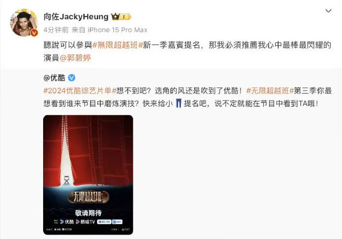 搜狐娱乐讯 5月15日,向佐发文:说可以参与《无限超越班》新一季嘉宾提名,那我必须推我心中最棒最闪耀的演员郭碧婷。 据悉,《无限超越班》是一挡演技类综艺,向佐曾参与第二季的录制。