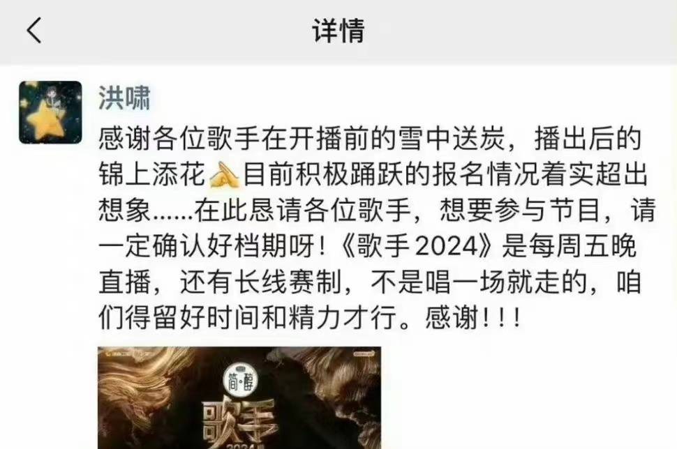 不过在阵容引发争议后,导演也是亲自下场在朋友圈表态,先表示自己对所有歌手报名的感激,不过他特意提到了开播前是雪中送炭,开播后是锦上添花。而感谢之后,导演更表示希望歌手在报名时能够确认好档期,不是上来唱一首歌就走,是要预留好完整的档期。