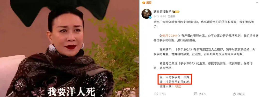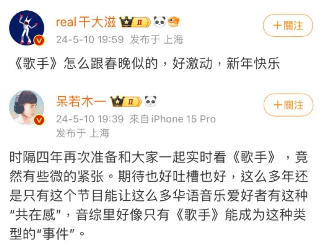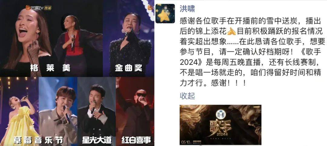 另一方面,导演组使得好一手见招拆招的独孤九剑,主打一个放任舆论场玩梗而我自岿然不动。最近 #歌手导演洪啸发文# 敲打请战歌手“我们不是唱一场就走的”、“长线赛制得留好时间和精力才行”,既高情商回应了没实力没档期的别蹭,又再次摆明了专业做音综的严谨态度。