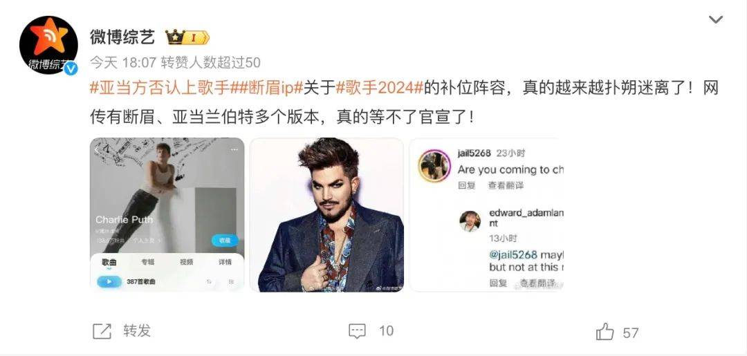 所以《歌手2024》首期最大的惊喜悬念,也是让犀牛君起鸡皮疙瘩的桥段,就是流程走完后突然放出一个神秘的电话录音彩蛋,彩蛋指向一位欧美歌手与节目组沟通合作事宜,细心乐迷马上猜出该嗓音疑似出自Adam Lambert或Charlie Puth(断眉)。该彩蛋坐实了节目很可能真的会请来此前网传的某些欧美大咖歌手,这无疑大大推高了各路看客对《歌手2024》的持续关注与期待。