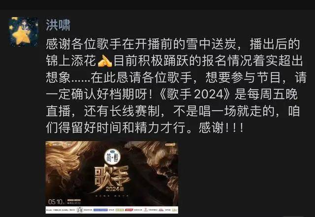《歌手2024》导演洪啸通过朋友圈发文回应了歌手们的“请战”,他称:“感谢各位歌手在开播前的雪中送炭,播出后的锦上添花。目前积极踊跃的报名情况着实超出想象……在此恳请各位歌手,想要参与节目,请一定确认好档期呀!《歌手2024》是每周五晚直播,还有长线赛制,不是唱一场就走的,咱们得留好时间和精力才行。感谢!!!”