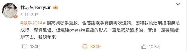 林志炫发文称:因为巡演撞期,所以无法来到《歌手2024》,他扬言明年过来!
