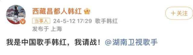 5月12日晚,韩红发微博申请加入《歌手2024》,冲上了热搜。后来,还有网友贴出“歌手正确报名方式”,调侃韩红的报名方式错了。