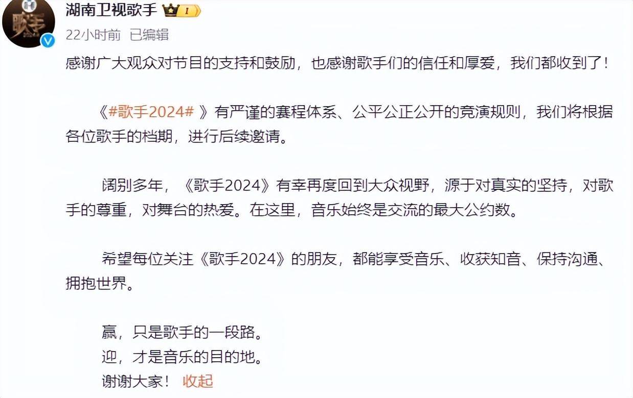 节目组连夜发声称竞演有严谨的流程,会根据歌手的档期邀约。