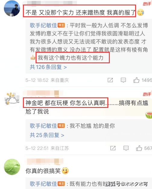 尤其是纪敏佳,用词不当惹群嘲,过于高估自己了,说自己代表了国家队,直呼内娱的尊严去哪了?可评论区网友对她的评价则是:又没有那个实力,还来蹭热度,大家只是在玩梗,她这么当真就很让人无语,那英都比不过人家,自己几斤几两不知道吗?