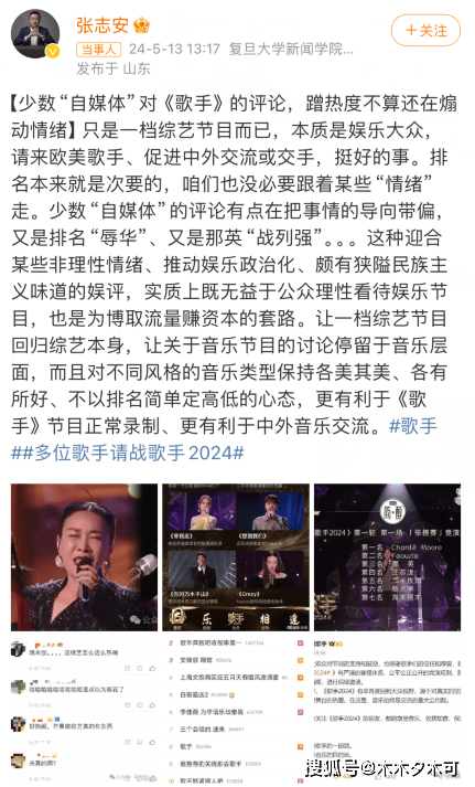 复旦大学新闻学院教授张志安也发文表示:《歌手》只是一档综艺节目,本质是娱乐大众,请来欧美歌手、促进中外交流或交手,本身是挺好的事,排名都是次要的,大家对节目的讨论应该留在音乐层面上,而节目组也应该回归综艺本身,不要为了博取流量整套路。