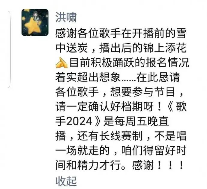 原标题:《歌手2024》导演洪啸疑回应众人报名 想要参与节目请确认好档期