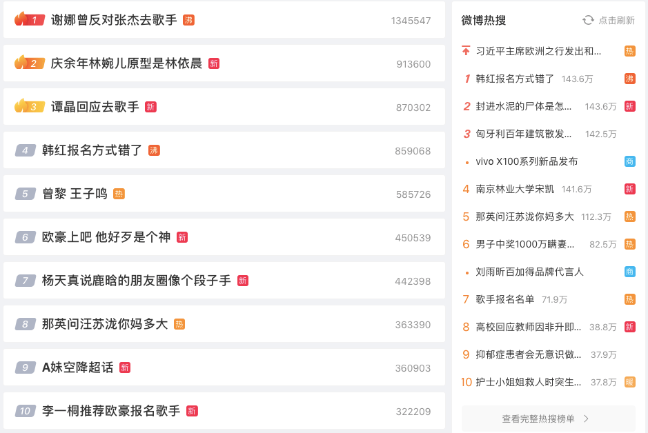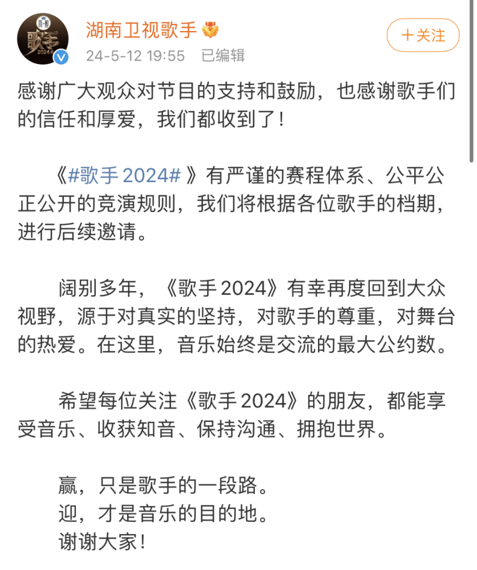 从5月10日晚20:00在湖南卫视及芒果TV现场直播到今天,《歌手2024》的话题还在刷屏,看乐子的、写段子的以及回应舆论积极响应的歌手们,微博文娱榜几乎被《歌手2024》相关的话题讨论屠榜。