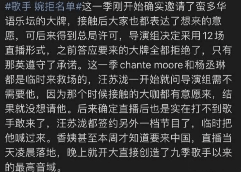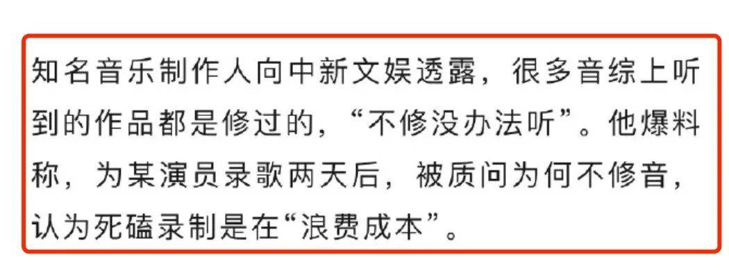 另外内业人士表示,如果歌手唱不好就一遍遍的重录,会大大增加节目的录制成本。所以节目组也宁愿后期给歌手修音,也不想浪费时间。