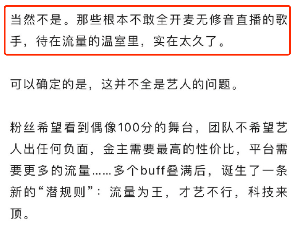 这会造成一个什么后果呢?歌手不思进取,靠着“科技与狠活”,随便唱唱都能备受夸赞。反正每一次跑调、破音,都会有后期进行拯救。在综艺节目里,观众什么都听不出来。