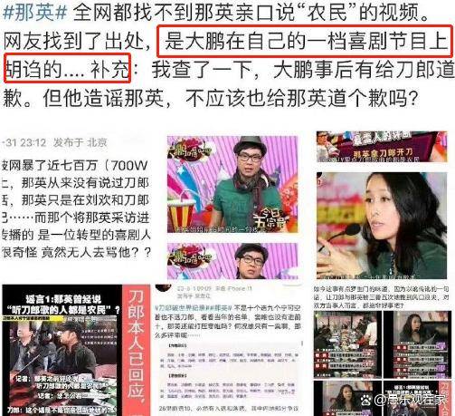 结果后来又被扒出全网都找不到那英亲口说的“农民”视频,网友发现是在大鹏的一档喜剧节目上胡诌的↓