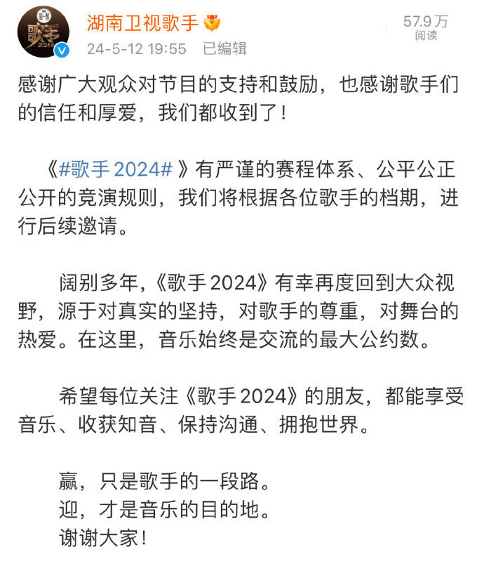 搜狐娱乐讯 5月12日,《歌手》官方发长文回应了近期的网友摇人事件,称节目组将根据各位歌手的档期,进行后续邀请。“赢,只是歌手的一段路。迎,才是音乐的目的地”。