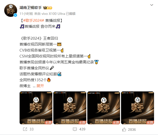 《歌手2024》也通过官方媒体发布了收视率等数据战报,如下: