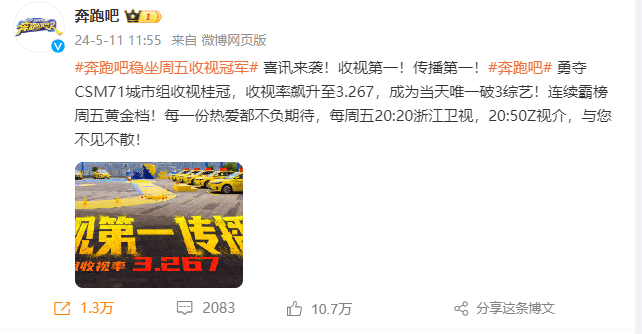 《奔跑吧》官方媒体发布收视率战报,如下: